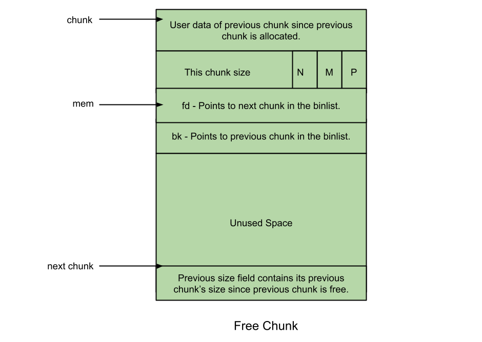 Chunks are the main object that users interact with. There are two main states to a chunk: allocated and free. The following picture demonstrates a free chunk: