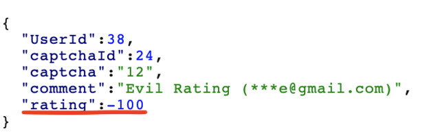 This seemed like fertile testing ground to go through, as I remembered the Juice Shop example from years ago. I used a web app pentesters best friend Burp to proxy the request and altered the rating to be -5000. But, this failed with a 500 error, which surprised me, since the application had never thrown me a 500 error like this before. After trying increasingly smaller negative numbers, to my surprise, -500 worked! I did the same thing in the positive direction with positive 500 and this worked as well. It appears they had some sanity checking on the values but not enough. What does this actually mean though?