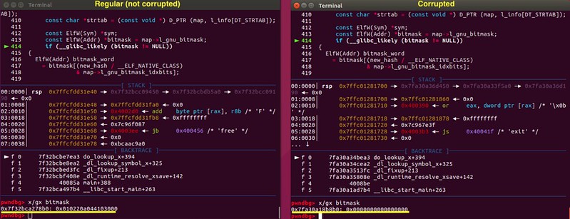 After setting up a version of LibC with debugging symbols and source code attached, the reversing was ready to go. To do the actual debugging, I had two windows open: the modified version (corrupted) and one with the regular flow (non-corrupted). The corrupted version will only have NULLs in this section to start with because mmap initializes all memory to NULL. Figure 5 shows this setup:
